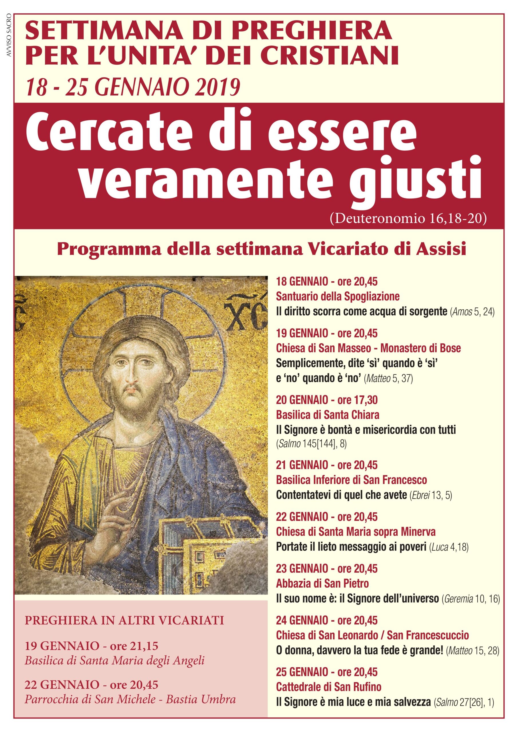 ASSISI – “Cercate di essere veramente giusti” è il tema della settimana di Preghiera per l’unità dei cristiani 2019, proposto ed elaborato dalle comunità cristiane dell’Indonesia. Nella diocesi di Assisi – Nocera Umbra – Gualdo Tadino le celebrazioni, una o più ciascun giorno, costituiranno come un ottavario peregrinante che inizierà venerdì 18 alle ore 20,45 nel Santuario della Spogliazione e si …