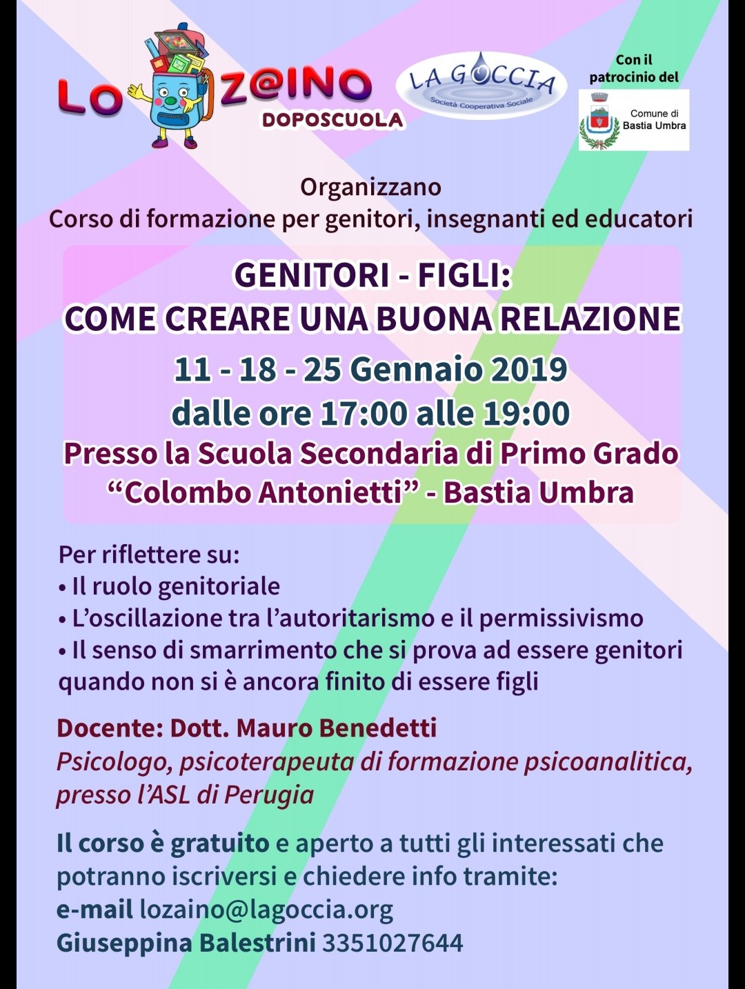La società cooperativa sociale La Goccia organizza all’interno del progetto doposcuola ‘LoZaino’ un corso di formazione per genitori, insegnanti ed educatori dal titolo GENITORI-FIGLI: COME CREARE UNA BUONA RELAZIONE. il corso di formazione si articola in tre incontri: 11, 18 e 25 gennaio 2019 gennaio 2019 dalle 17.00 alle 19.00 presso la scuola secondaria di primo grado Colomba Antonietti di Bastia …