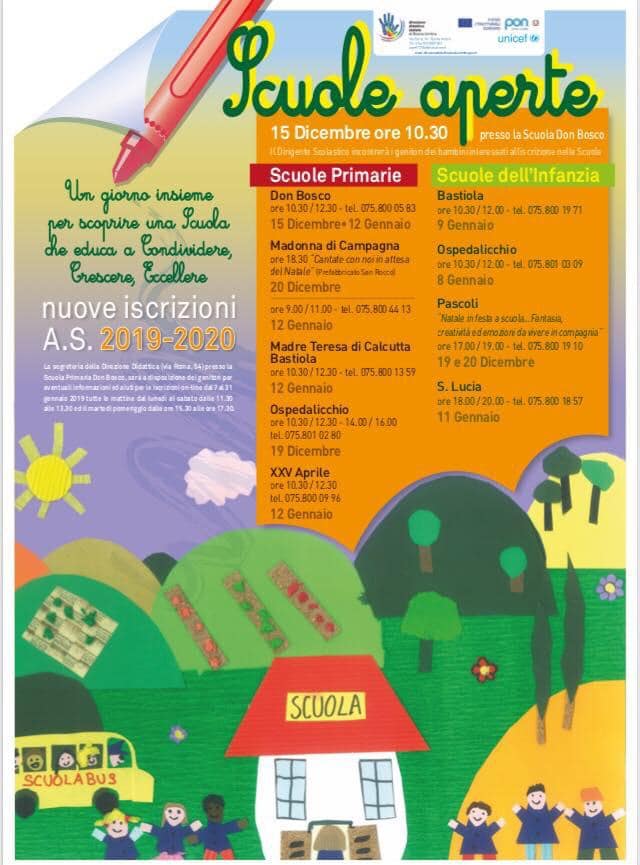 Le scuole del territorio si aprono alla visita di alunni e genitori; di seguito le prossime date : Direzione Didattica “Don Bosco”: Scuola dell’Infanzia_ Venerdì 11 Gennaio -Scuola S.Lucia: ore 18.00 – 20.00 Scuole Primarie_ Sabato 12 Gennaio “Don Bosco” ore 10.30 – 12.30 – Ospedalicchio ore 10.30 – 12.30/14.00 – 16.00 – Scuola “Madre Teresa di Calcutta” …