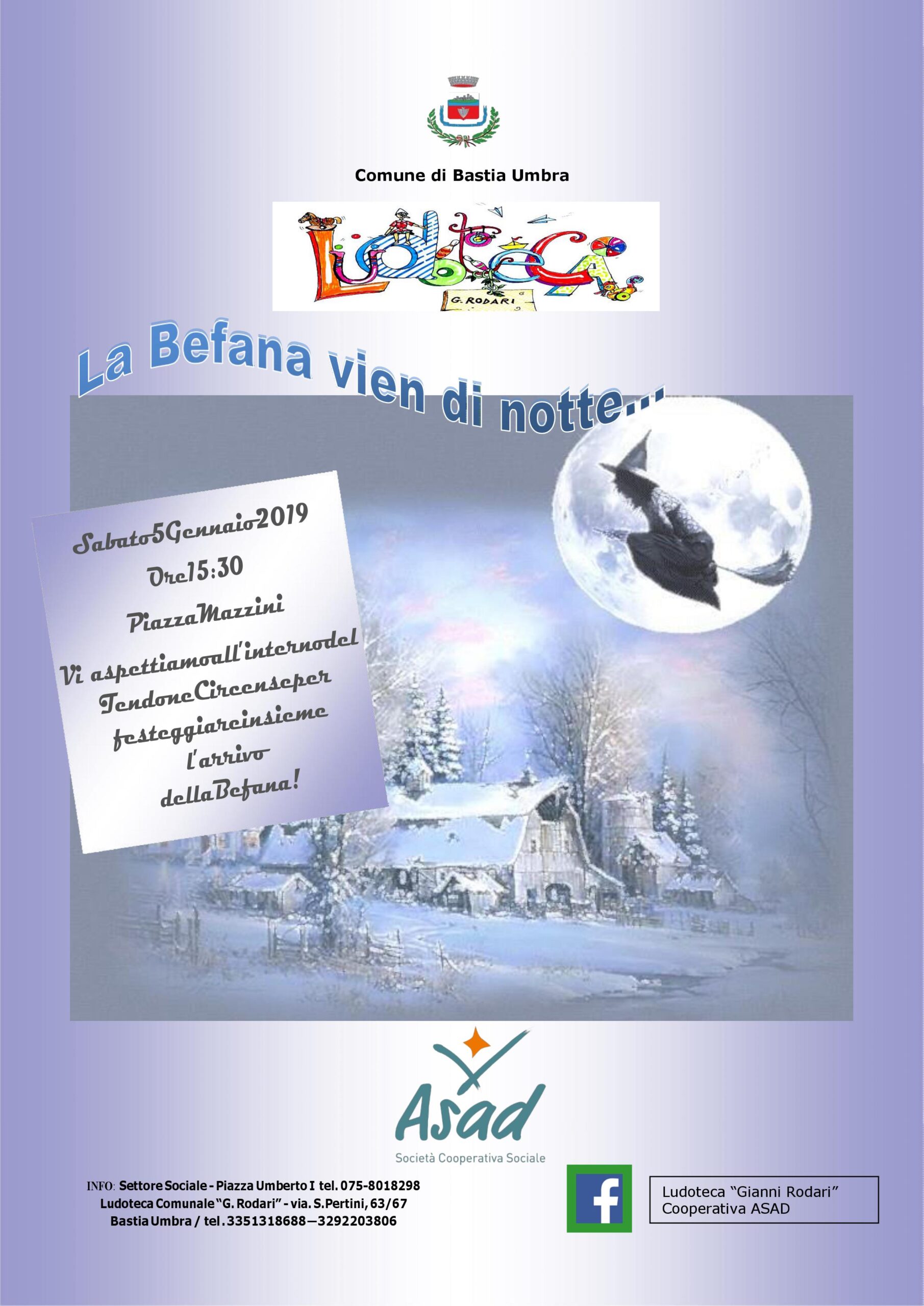 Sabato 5 gennaio 2019 ore 15,30 “La Befana vien di notte”: in Piazza Mazzini si festeggerà l’arrivo della befana presso il tendone circense di Bastia Wonderland. L’iniziativa è curata dagli operatori della ludoteca comunale “G.Rodari” – Coop. Asad. Sabato 5 gennaio alle ore 17.30 “Cantata di Natale” , rappresentazione teatrale ideata e realizzata dal Laboratorio teatrale dell’Unilibera.Regia di …