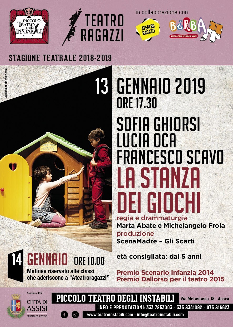 ASSISI – Dopo il “tutto esaurito” del primo spettacolo della Stagione di Teatro Ragazzi organizzata dall’Associazione Culturale “Gli Instabili” in collaborazione con Birba e Ateatroragazzi e con il sostegno del Comune di Assisi e della Regione dell’Umbria, il 13 e il 14 gennaio al Piccolo Teatro degli Instabili, è in arrivo il secondo imperdibile appuntamento. In scena “La stanza dei …