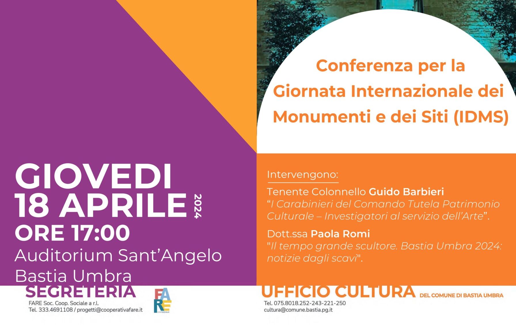 A Bastia Umbra nella Giornata Internazionale dei Monumenti e dei Siti giovedì 18 aprile una conferenza alle ore 17.00 presso l’Auditorium Sant’Angelo sulla tutela delle opere d’arte e sui recenti scavi archeologici.