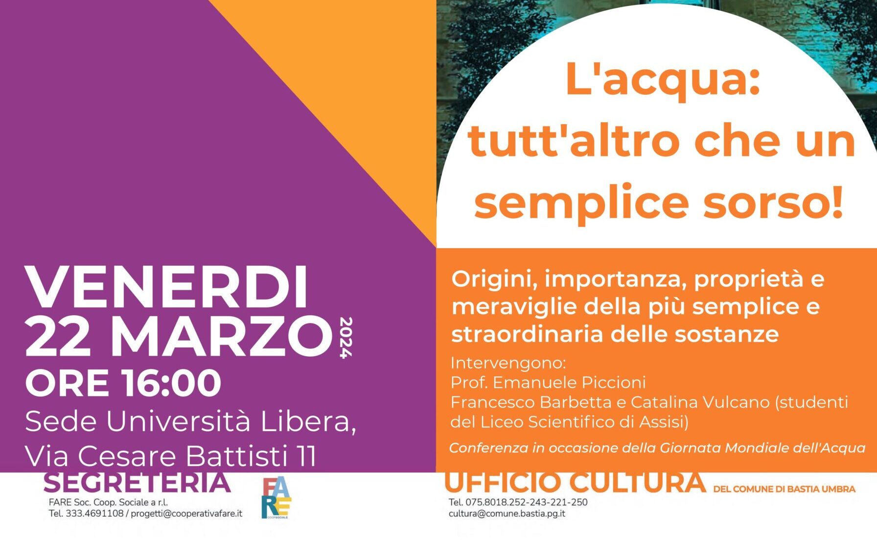 In occasione della Giornata Mondiale dell’Acqua, ricorrente il 22 Marzo, il Comune di Bastia Umbra – Assessorato alla Cultura e Università Libera – proporrà alla cittadinanza una conferenza dal titolo: “L’acqua, tutt’altro che un semplice sorso! Origini, importanza, proprietà e meraviglie della più semplice e straordinaria delle sostanze”. Alla conferenza, che si svolgerà alle ore 16.00 presso la sede di …