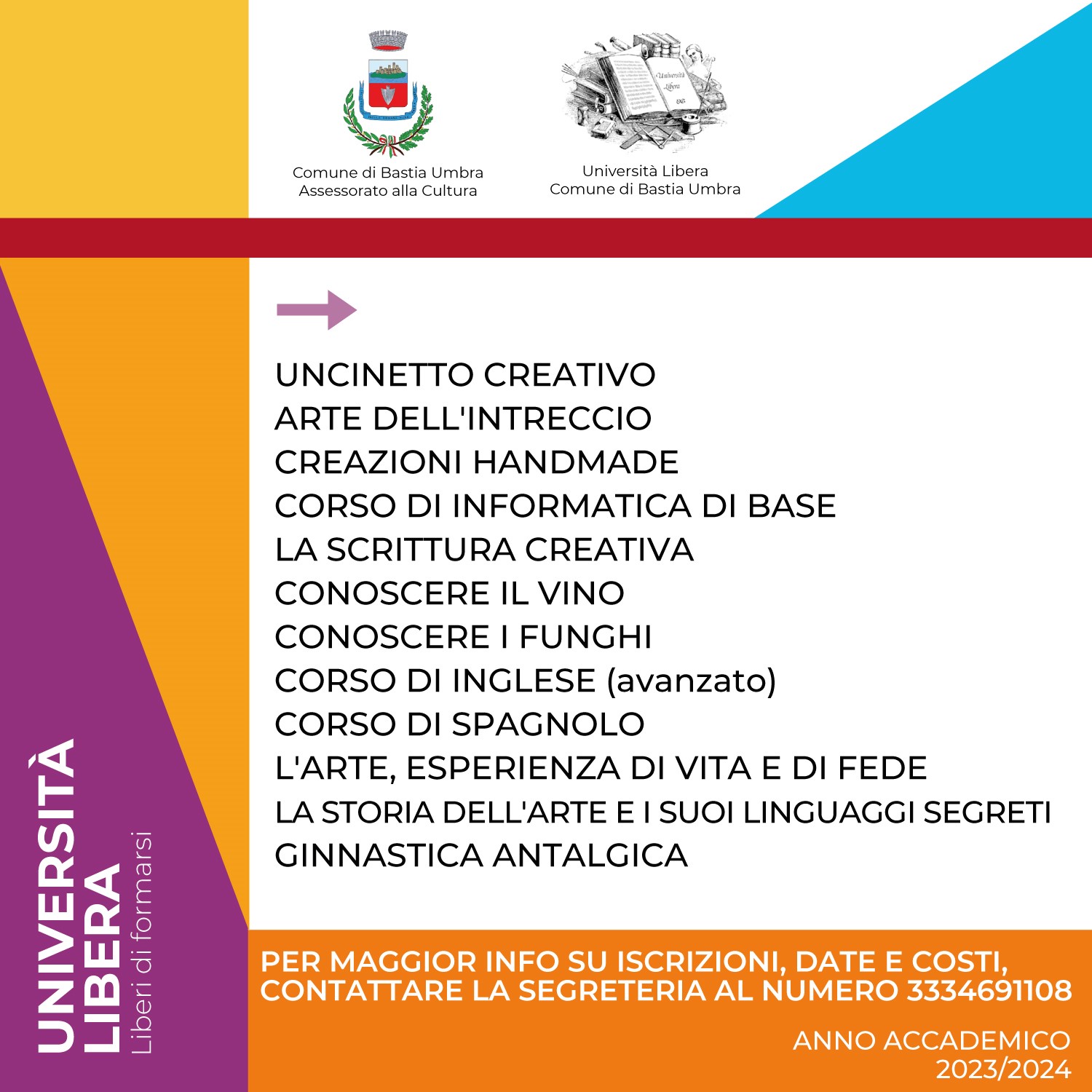 Open Day dell’Università Libera di Bastia Umbra. L’evento avrà luogo a Bastia Umbra sabato 20 gennaio 2024 dalle 16.00 alle 17.30 circa, presso la sede dell’Università Libera, in via Cesare Battisti 11 (ex Servizi Demografici). Un’occasione per chi è interessato a conoscere tutti i dettagli dei corsi e a parlare con i docenti, che saranno presenti. L’incontro sarà l’occasione per illustrare la …
