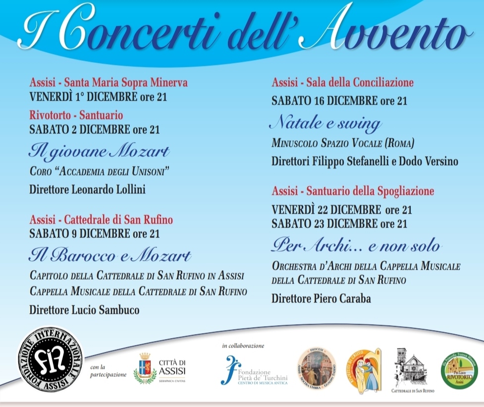 Chiudono la prestigiosa rassegna musicale “Dimusa” organizzata dalla Fondazione Internazionale Assisi, venerdì 22 e sabato 23 dicembre 2023 alle ore 21, ad Assisi, due concerti, al Santuario della Spogliazione. ” L’ Orchestra d’archi della cappella musicale della Cattedrale di San Rufino” si esibirà nel concerto “Per archi … e non solo”, diretto dal Maestro Piero Caraba. L’ ingresso è gratuito.
