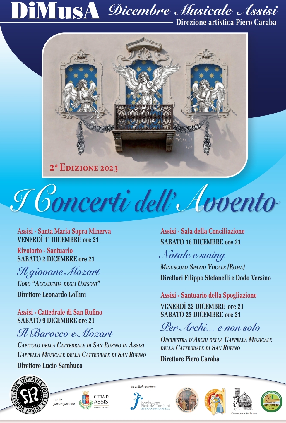 Terzo evento della rassegna musicale “Dimusa” organizzata dalla Fondazione Internazionale Assisi, sabato 9 dicembre 2023 alle ore 21 nella Cattedrale di San Rufino. Il coro e l’ orchestra della Cattedrale si esibirà nel concerto “Il Barocco e Mozart”, diretto dal Maestro Lucio Sambuco. L’ ingresso è gratuito. 07/12/2023 Segreteria FIA
