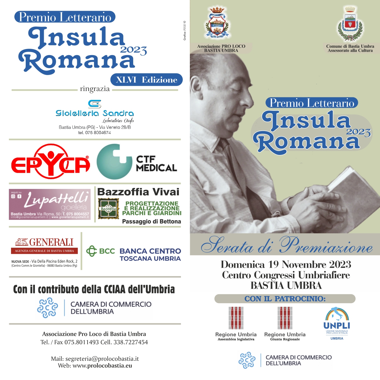 Domenica 19 Novembre 2023 dalle ore 17 presso il Centro Congressi del Centro Fieristico Umbriafiere di Bastia, si terrà la cerimonia di premiazione del Premio Insula Romana 2023 organizzata dalla Pro Loco con il patrocinio del Comune di Bastia Umbra. 16/11/2023 Il Presidente Matteo Santoni ASSOCIAZIONE PRO LOCO BASTIA