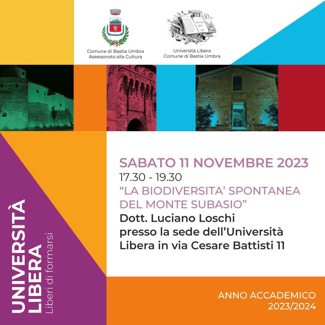 Sabato 11 novembre 2023 la conferenza “La Biodiversità spontanea del Monte Subasio” con il Dott. Luciano Loschi presso i locali del Servizio di Università Libera in via Cesare Battisti (locali ex anagrafe) Ingresso libero Iniziano anche per l’anno accademico 2023/2024 le conferenze dell’Università Libera di Bastia Umbra. La prima sarà sabato 11 novembre 2023 dalle 17.30 alle 19.30 con il …