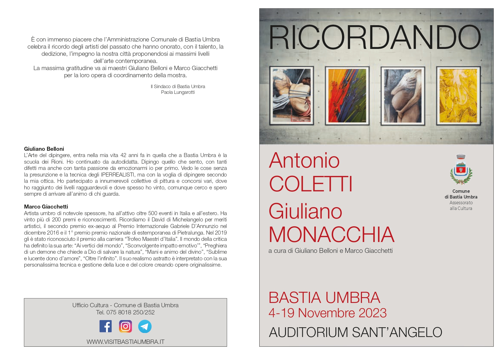 Dal 4 al 19 novembre presso l’Auditorium Sant’Angelo di Bastia Umbra una mostra di pittura per ricordare Antonio Coletti e Giuliano Monacchia, artisti bastioli che con creatività e passione hanno contribuito alla crescita culturale e sociale della nostra città. La mostra curata, da Giuliano Belloni e Marco Giacchetti, vedrà la cerimonia di apertura il 4 Novembre alle ore 16.30 presso …