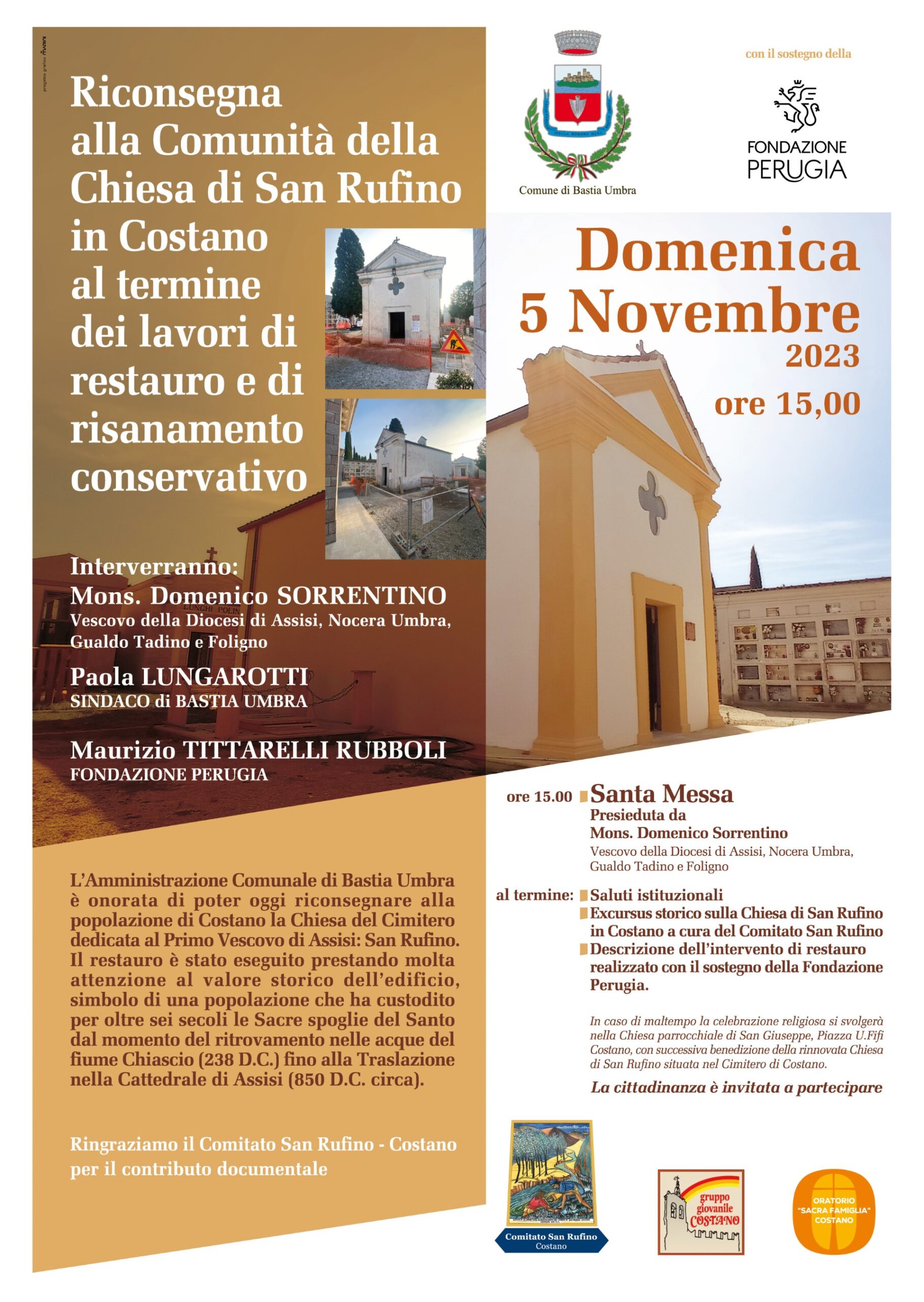 Una cerimonia religiosa solenne, presieduta dal Vescovo di Assisi, Mons. Domenico Sorrentino, sancirà la riapertura al pubblico della Chiesa di San Rufino in Costano il 5 Novembre 2023, dopo una chiusura di molti anni. La piccola chiesa si trova nel Cimitero di Costano e necessitava di interventi di restauro e di risanamento conservativo, effettuati ora dall’Amministrazione Comunale di Bastia Umbra, …