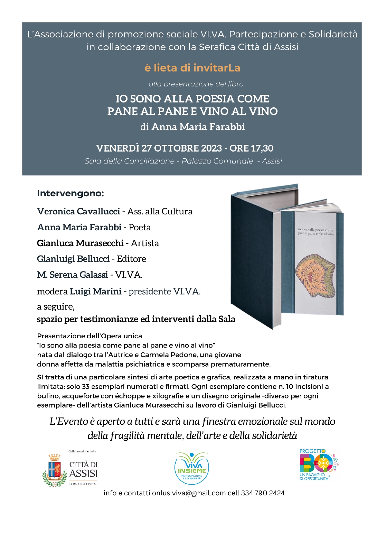 Ad Assisi la presentazione del libro di Anna Maria Farabbi “Io sono alla poesia come il pane al pane e il vino al vino”.