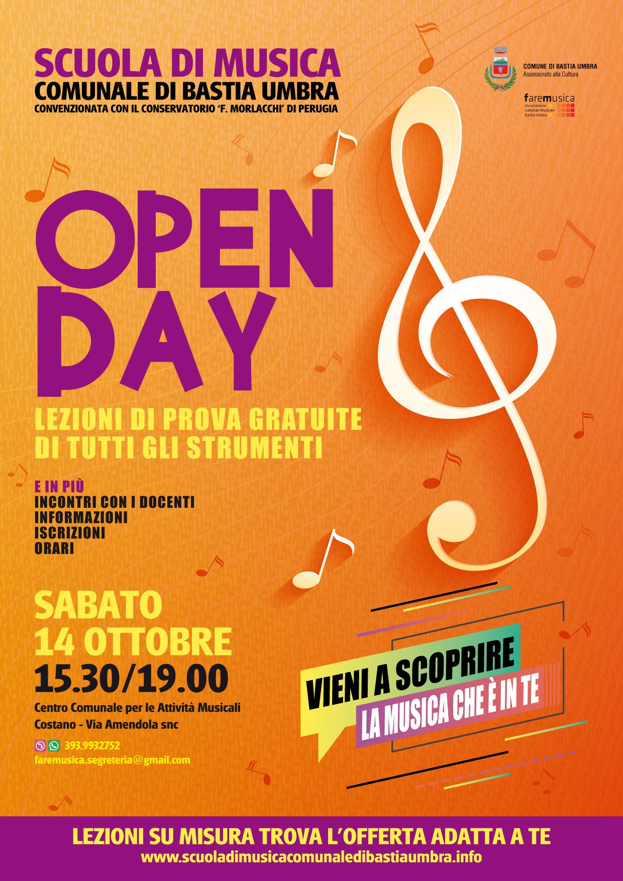 Scuola di Musica Comunale di Bastia Umbra: Open day sabato 14 ottobre. Lezioni di prova gratuite di tutti gli strumenti, visite, incontri, informazioni, iscrizioni.