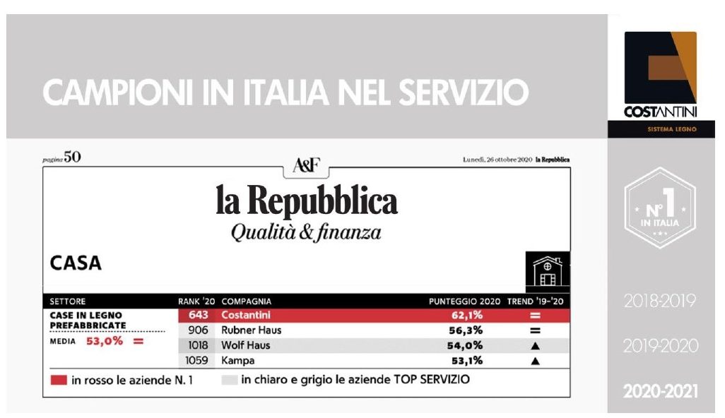Costantini Legno, infatti, è stata riconosciuta per il terzo anno consecutivi come “n.1 in Italia” nel servizio <a href=” https://www.costantinilegno.it/”>case prefabbricate in legno</>. L’importante riconoscimento viene rilasciato dall’Istituto Tedesco di Qualità e Finanza che analizza i dati su un campione di oltre 230.000 clienti intervistati in tutta Italia. L’azienda con sede a Bettona, e guidata dai bastioli Luisa e Alessio Costantini, è specializzata nella produzione” di legno lamellare …