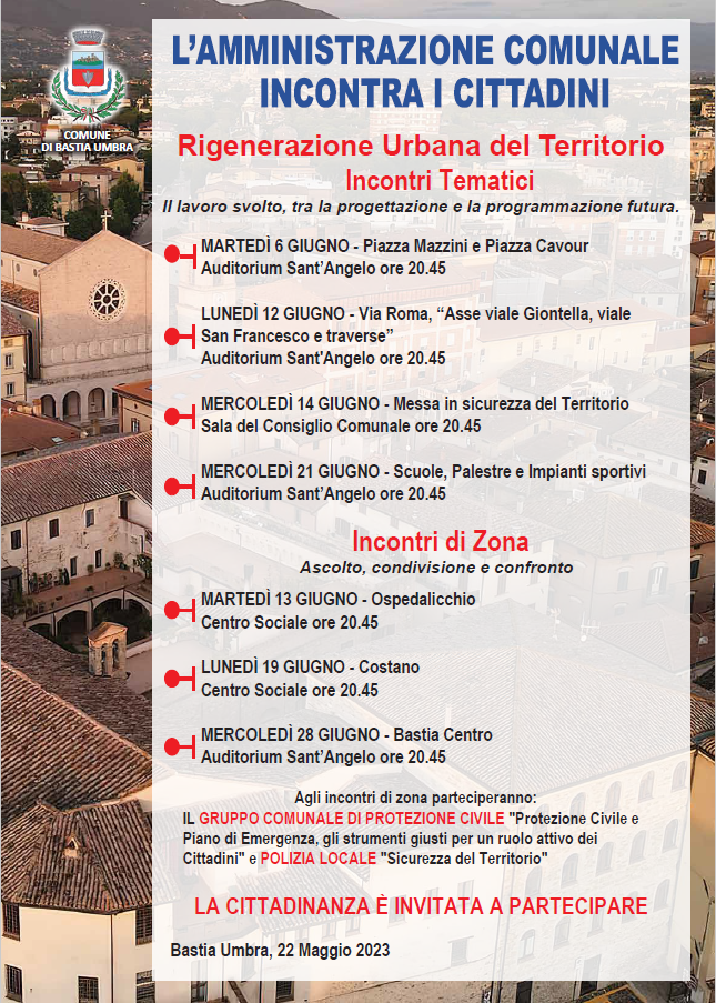 Un nuovo ciclo di incontri con la cittadinanza organizzato dall’Amministrazione Comunale di Bastia Umbra inizierà il 6 Giugno 2023, con termine il 28 dello stesso mese. Sette incontri, di cui alcuni tematici sulla Rigenerazione Urbana del nostro territorio con la presentazione del lavoro svolto, tra la progettazione e la programmazione futura: -Piazza Mazzini e Piazza Cavour: 6 giugno – Auditorium Sant’Angelo …