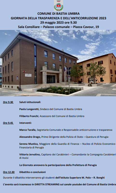 L’evento sarà trasmesso anche in diretta streaming sul canale youtube del Comune di Bastia Umbra La trasparenza delle Pubbliche Amministrazioni è un diritto dei cittadini definito dalla normativa come “accessibilità totale dei dati e documenti detenuti dalle pubbliche amministrazioni, allo scopo di tutelare i diritti dei cittadini, promuovere la partecipazione degli interessati all’attività amministrativa e favorire forme diffuse di controllo …