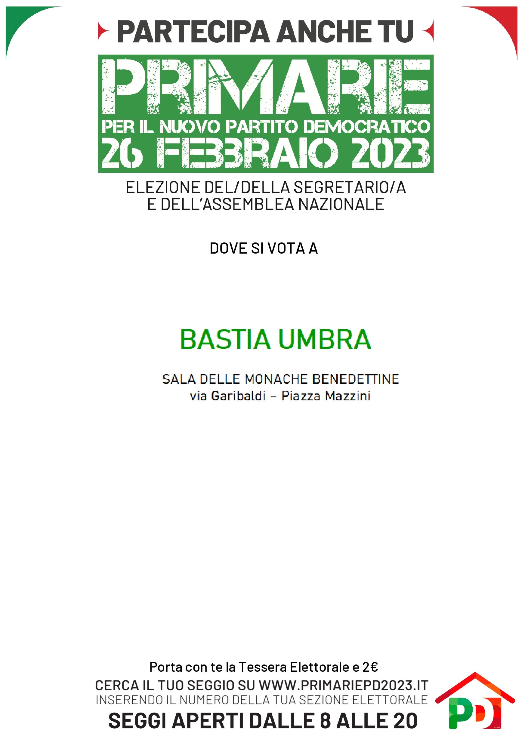 A Bastia Umbra si vota domenica 26 febbraio dalle 8 alle 20 presso la Sala delle Monache Benedettine (Via Garibaldi – Piazza Mazzini).