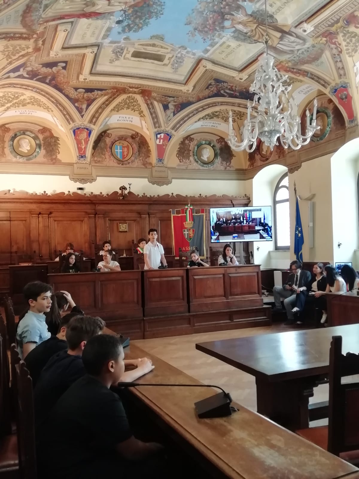 A circa un mese dall’insediamento del Consiglio Comunale dei Ragazzi, stamattina, con inizio alle 10, si è tenuta un’altra seduta nella sede municipale di piazza del Comune. Dopo gli inni, il sindaco Sebastiano Punzi, eletto nella precedente seduta del 9 aprile, ha esposto il programma di mandato e ha toccato i vari temi, dall’istruzione alla politica ambientale, dal tempo libero-sport …