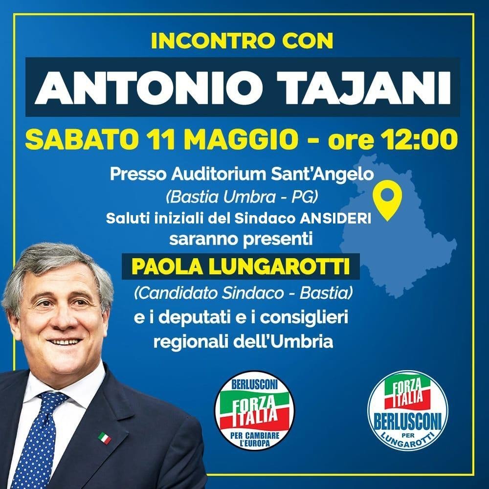 Un incontro con l’onorevole Antonio Tajani alle ore 12.00 presso l’Auditorium Sant’Angelo per parlare di fondi europei. Saranno presenti oltre il Sindaco Stefano Ansideri, il candidato sindaco Paola Lungarotti, coalizione di centro destra, Forza Italia, Fratelli d’Italia, Bastia Popolare, Paola Lungarotti Sindaco, i deputati di Forza Italia dell’Umbria Il presidente Antonio Tajani candidato per la nostra circoscrizione al Parlamento Europeo …