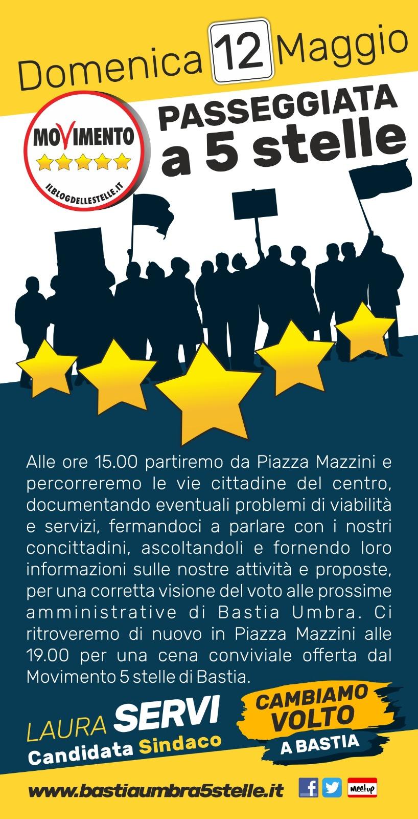 Domenica 12 maggio alle ore 15, con partenza dalla sede elettorale di Bastia, in piazza Mazzini, 77, i cittadini del Movimento 5 Stelle passeggeranno insieme ai concittadini per le vie del nostro centro cittadino. Sara l’occasione per incontrarci e parlare del nostro programma elettorale e conoscere il nostro candidato Sindaco Laura Servi e tutta la squadra dei consiglieri M5S. Saranno presenti alla …