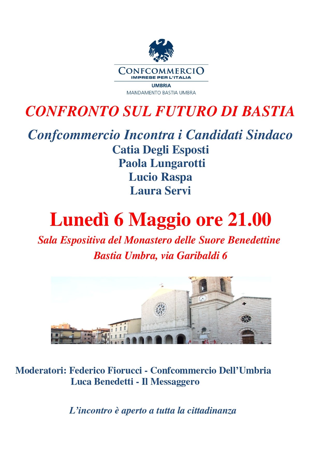 Confcommercio Mandamento Bastia organizza per lunedì 6 maggio, alle ore 21.00, presso la sala espositiva del Monastero delle Suore Benedettine, in via Garibaldi 6, Bastia Umbra, un incontro con tutti i candidati a sindaco per la città di Bastia. Invitati tutti gli imprenditori del terziario. E’ un iniziativa promossa per consentire ai commercianti ed operatori economici non solo di conoscere …
