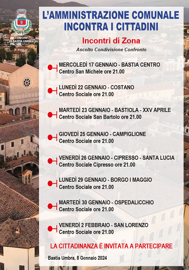 Le assemblee pubbliche con le cittadine e i cittadini di Bastia Umbra continuano lunedì 22 Gennaio presso il Centro sociale di Costano per condividere l’attività svolta, per illustrare il Bilancio di Previsione 2024-2026 approvato nel Consiglio Comunale di Dicembre u.s. Tutti gli incontri di zona si svolgeranno alle ore 21.00. Seguiranno: -Martedì 23 Gennaio- Bastiola e XXV Aprile – presso …