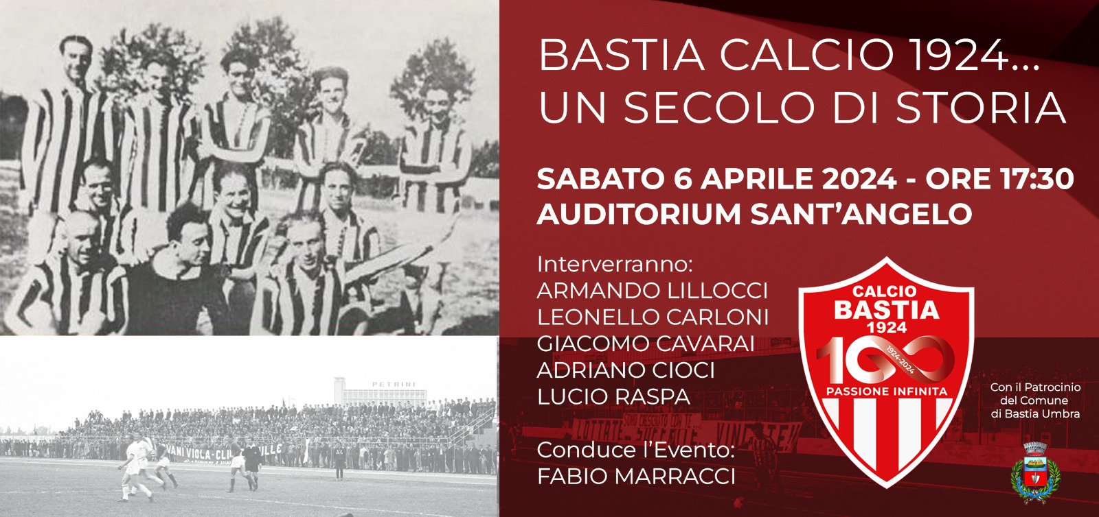 Sabato 6 Aprile alle ore 17:30 BASTIA UMBRA Sabato 6 Aprile alle ore 17:30 presso l’Auditorium Sant’Angelo in piazza Umberto 1°, si svolgerà un evento di natura Storico Culturale “Bastia calcio 1924… Un secolo di storia” , patrocinato dal Comune di Bastia Umbra e organizzato dalla tifoseria e dalla dirigenza del Bastia Calcio 1924. Interverranno Armando Lillocci, Leonello Carloni, Adriano Cioci, Giacomo …