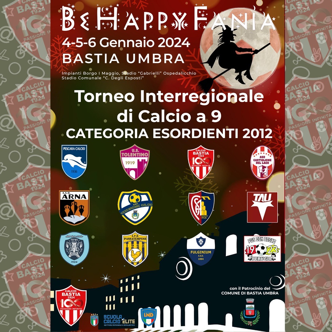 BEHAPPYFANIA – TORNEO INTERREGIONALE DI CALCIO A 9 RISERVATO AGLI ESORDIENTI 2012 4-5-6 GENNAIO 2024 BASTIA UMBRA Prenderà il via giovedì 4 gennaio l’Edizione 2024 del Torneo BeHappyFania che vedrà impegnate ben 12 squadre di Esordienti 2012 provenienti da diverse regioni italiani. Le squadre avranno la possibilità di confrontarsi sul campo, ma anche, nei momenti di pausa del Torneo, di …