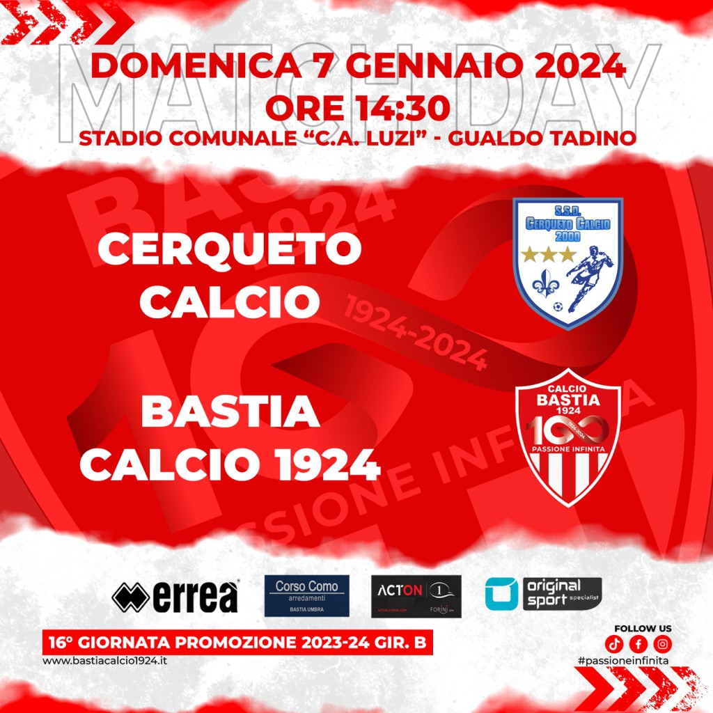 Calcio Promozione girone B BASTIA UMBRA -Dopo la pausa natalizia, domani domenica 7 gennaio alle ore 14:30, allo stadio Carlo Angelo Luzi di Gualdo Tadino , il Bastia 1924 affronterà il Cerqueto calcio. L’incontro sarà diretto dal Sig. Andrea Bartolucci della sezione di Città di Castello. Sarà assistito nell’occasione da Elia Costantini della sezione di Foligno e Alessio Amadei della sezione di Terni. . …