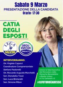 Interverranno, oltre al candidato sindaco Catia Degli Esposti, gli On. Virginio Caparvi e Riccardo Augusto Marchetti, i Senatori Donatella Tesei, Luca Briziarelli, Simone Pillon e il coordinatore comprensoriale Stefano Pastorelli.
