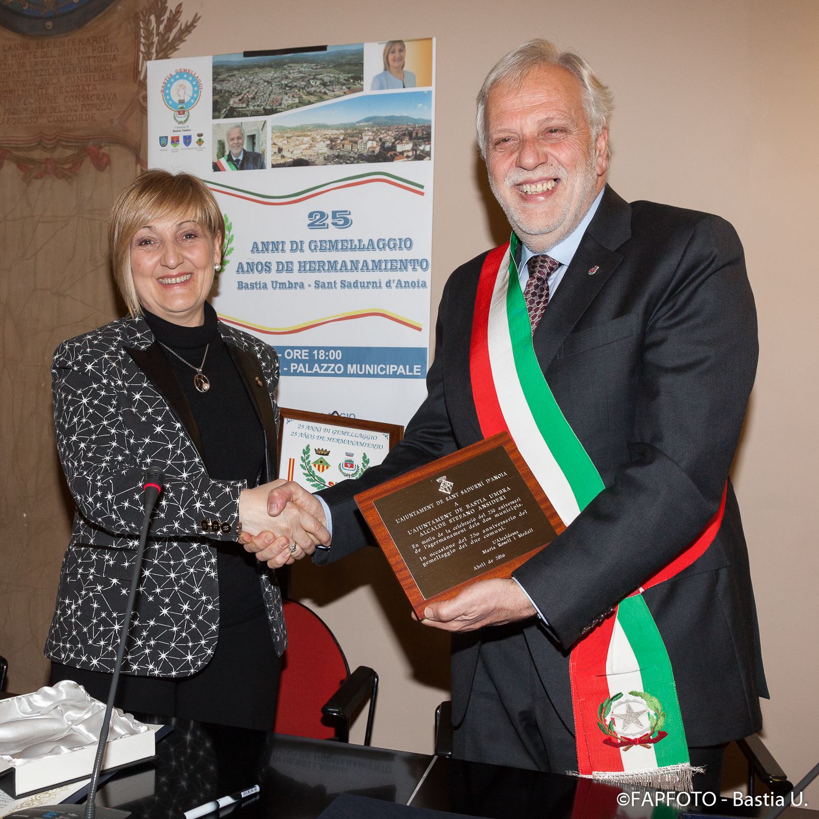 All’Alcaldessa (sindaco) di Sant Sadurni d’Anoia, Maria Rosell Y Medall, è stato consegnato in omaggio un pregevole manufatto di ceramica prodotto per l’occasione dal Corso di Ceramica dell’Unilibera di Bastia Umbra. Unilibera ha anche fornito un prezioso contribuito mettendo a disposizione propri docenti di lingua spagnola e francese. A conclusione della cerimonia del patto, i docenti dell’Associazione Faremusica, maestri Beata Bukor (violino) e Antonio Ruvo (chitarra) si sono esibiti in una emozionante performance musicale. Mentre una lirica del poeta catalano Salvador Espriu (tratta dalla raccolta La pell de brau) è stata letta dai due Sindaci firmatari del patto nelle rispettive lingue (italiano e catalano). Le delegazioni estere hanno visitato l’Istituto Professionale “Marco Polo”, venendo a contatto con gli studenti dell’istituto professionale in una prospettiva di rilancio degli scambi scolastici da realizzarsi nelle comunità gemellate.