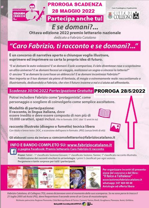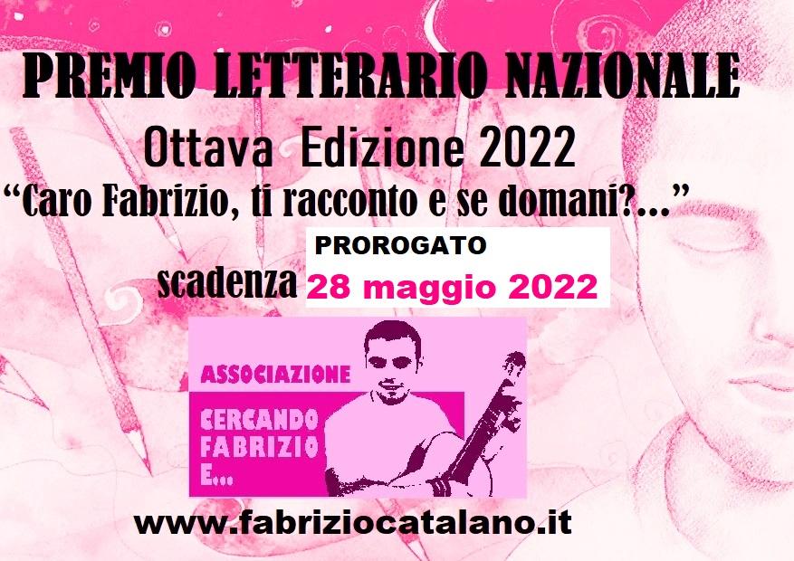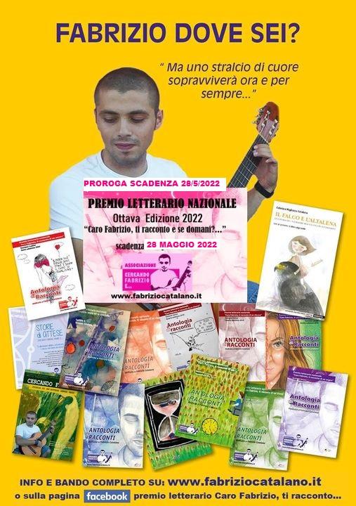 L’ottava edizione del concorso letterario istituito dall’Associazione “Cercando Fabrizio e…” si intitola “Caro Fabrizio, ti racconto e se domani?” ed è come sempre aperta a chiunque voglia esprimere e imprimere su carta un ricordo in forma scritta o illustrata. La data di scadenza per far pervenire i racconti è stata prorogata al 28 maggio 2022 (farà fede la data dell’e-mail).