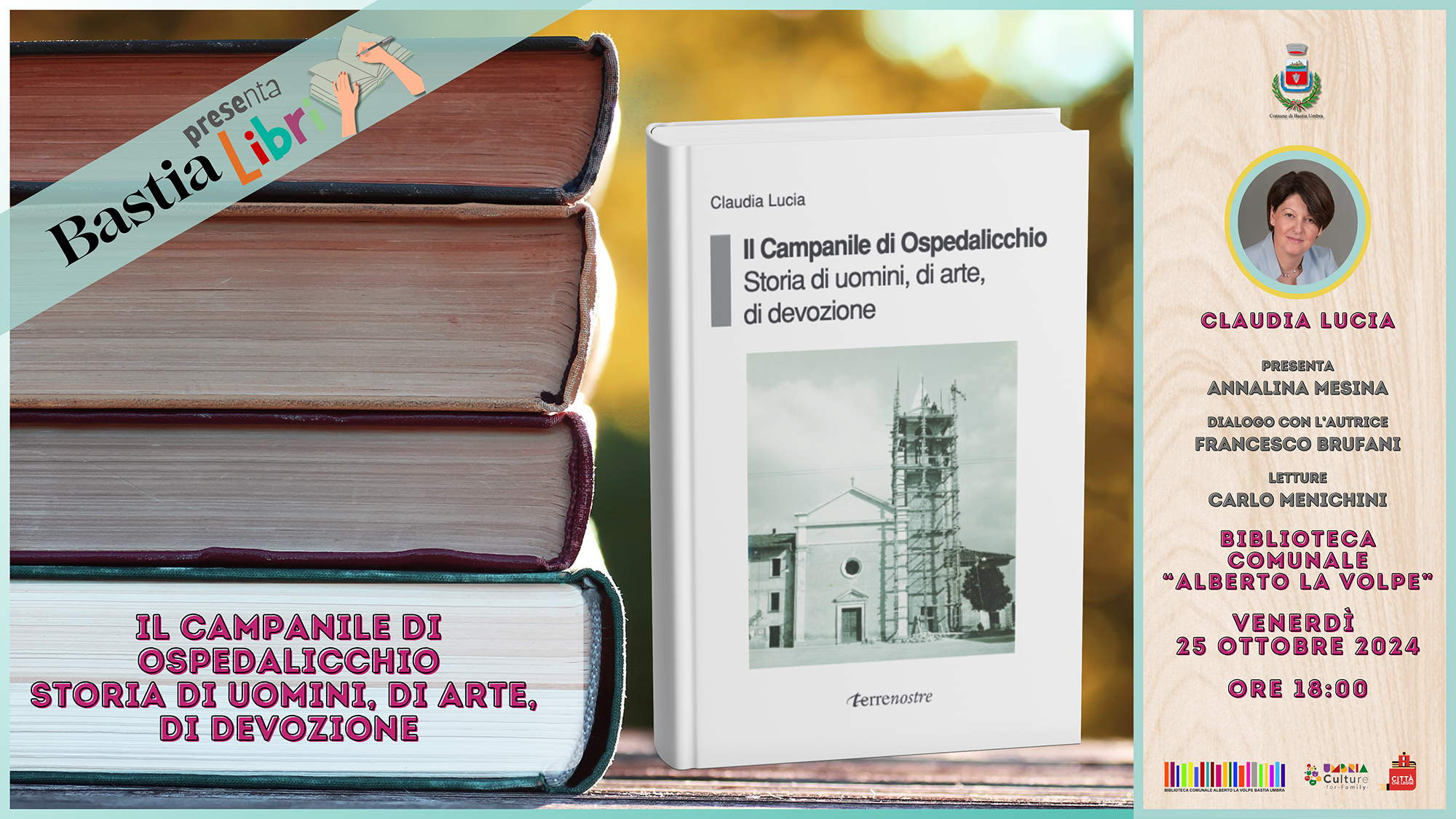 Bastia Umbra, 19 ottobre 2024 – È fissato per venerdì 25 ottobre 2024 alle ore 18:00, presso la Biblioteca Comunale “Alberto La Volpe”, il primo appuntamento del progetto “Bastia Presenta Libri” con la presentazione del libro di Claudia Lucia “Il Campanile di Ospedalicchio. Storia di uomini, di arte, di devozione” pubblicato per la Collana Storia e Memoria di Terrenostre nel Dicembre 2023.