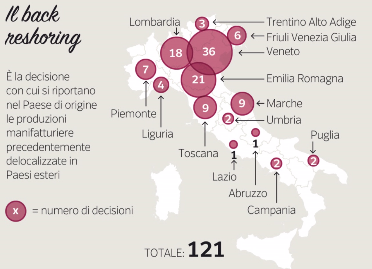 Claudio Ricci (consigliere regionale dell’Umbria) cita che ricerche, in ambito manifatturiero e servizi legati al Made in Italy, indicano, nell’ultimo periodo, un totale di 121 aziende italiane che hanno “preso la decisione di riportare nel paese di origine le produzioni manifatturiere delocalizzate nei paesi esteri” con azioni che vengono definite di “back reshoring”.Tale attività, qualora sollecitata con specifiche azioni, andrebbe ad attrarre opportunità in termini di sviluppo economico territoriale tutelando anche “identità, valori e creatività” dei luoghi di origine e, in questo caso, dell’Umbria (fenomeno che sembra “non adeguatamente” sviluppato nel Centro Sud d’Italia).