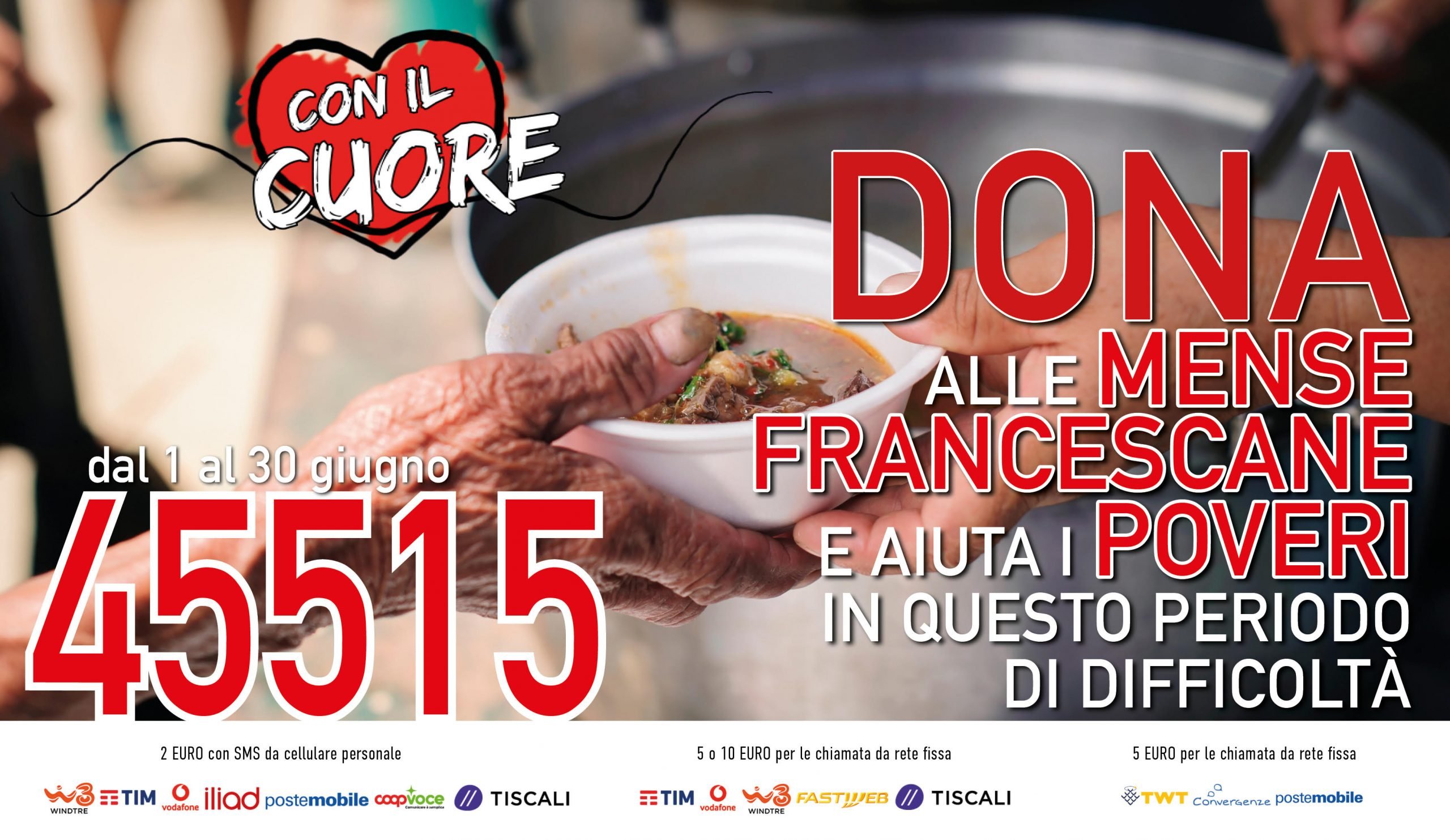 Sostieni “Con il cuore, nel nome di Francesco d’Assisi”: fino al 30 giugno dona 2 euro al 45515 con un sms da cellulare WINDTRE, TIM, Vodafone, Iliad, PosteMobile, Coop Voce, Tiscali. Oppure 5 o 10 euro per le chiamate da rete fissa TIM, Vodafone, WINDTRE, Fastweb e Tiscali e 5 euro per le chiamate da rete fissa TWT, Convergenze, PosteMobile.