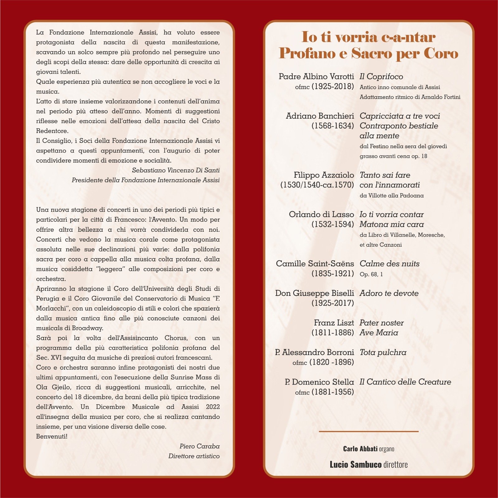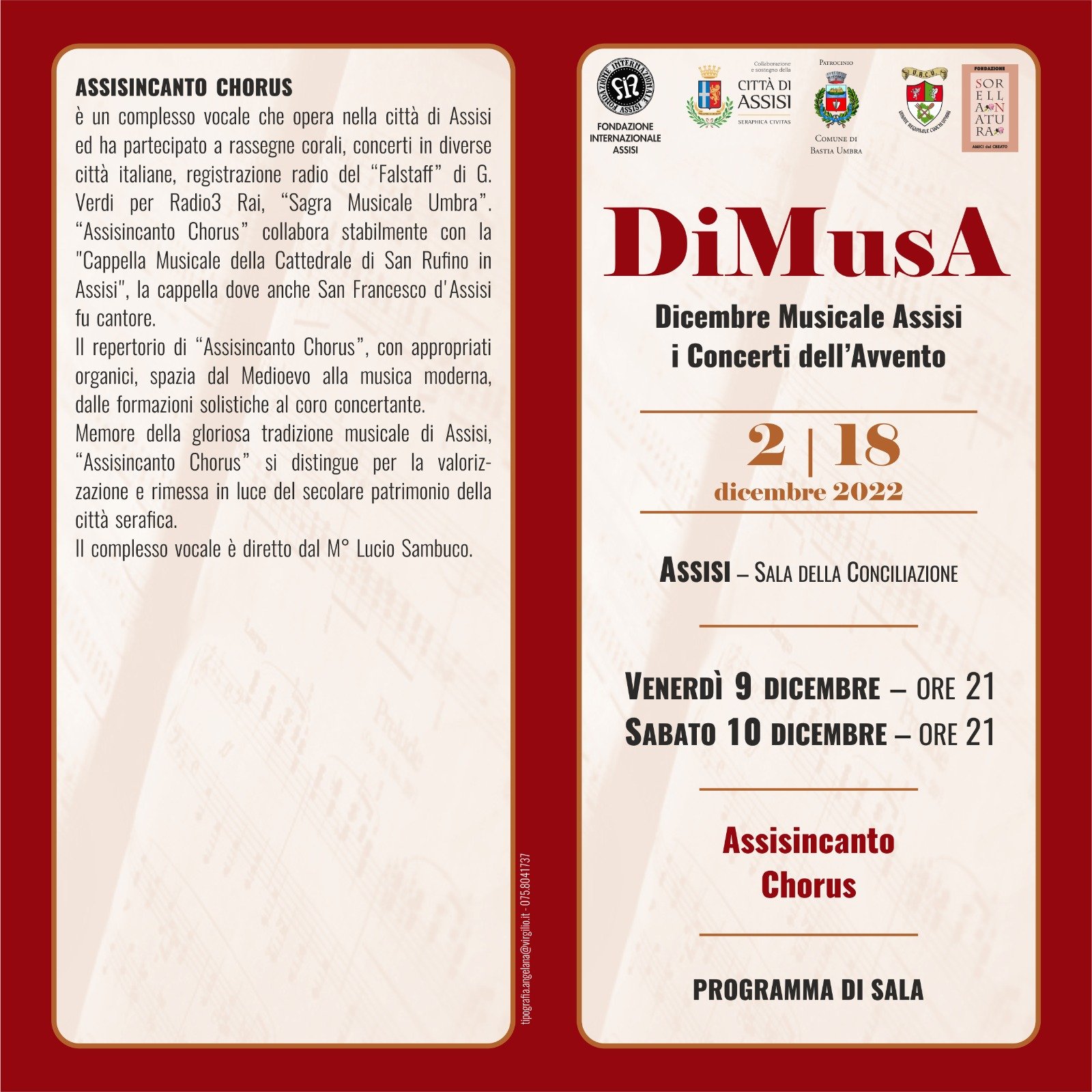 Venerdì 9 e sabato 10 dicembre alle 21,00 presso la sala della Conciliazione ad Assisi, diretti dal Maestro Lucio Sambuco “ Io Ti vorria cant profano e sacro per Coro” si esibiranno Assisicanto Chorus e Girolamo Diruta.