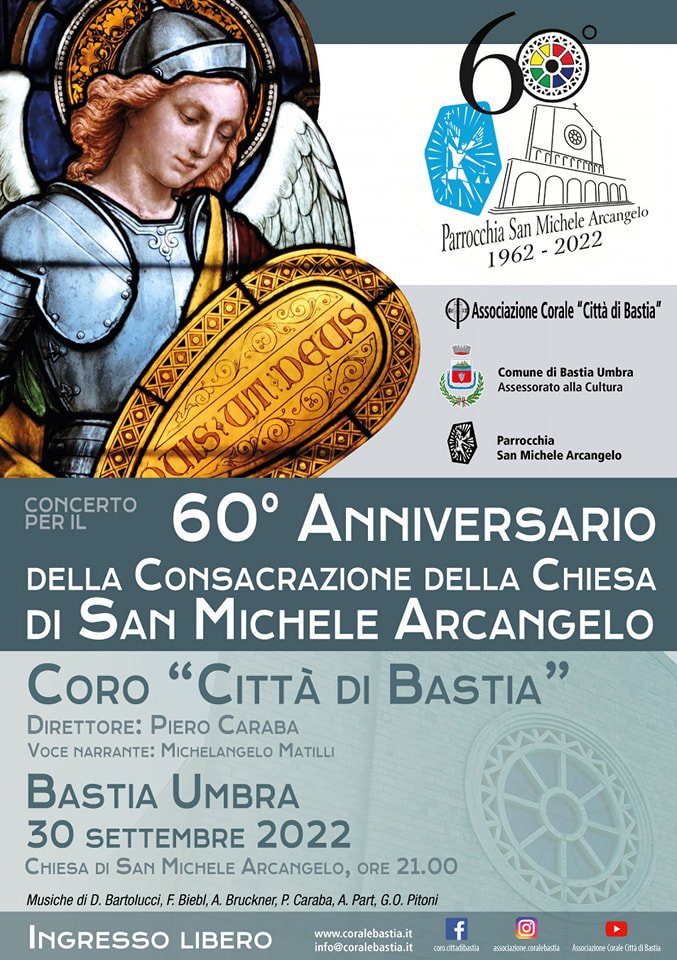 Venerdì 30 Settembre  nella Chiesa di San Michele Arcangelo a  Bastia Umbra, l’Associazione corale città di Bastia in concerto con il Direttore Piero Caraba,  con la voce narrante di Michelangelo Matilli,  le Musiche di D. Bartolucci, F. Biebl, A. Bruckner, P. Caraba, A. Part e G.O. Pitoni