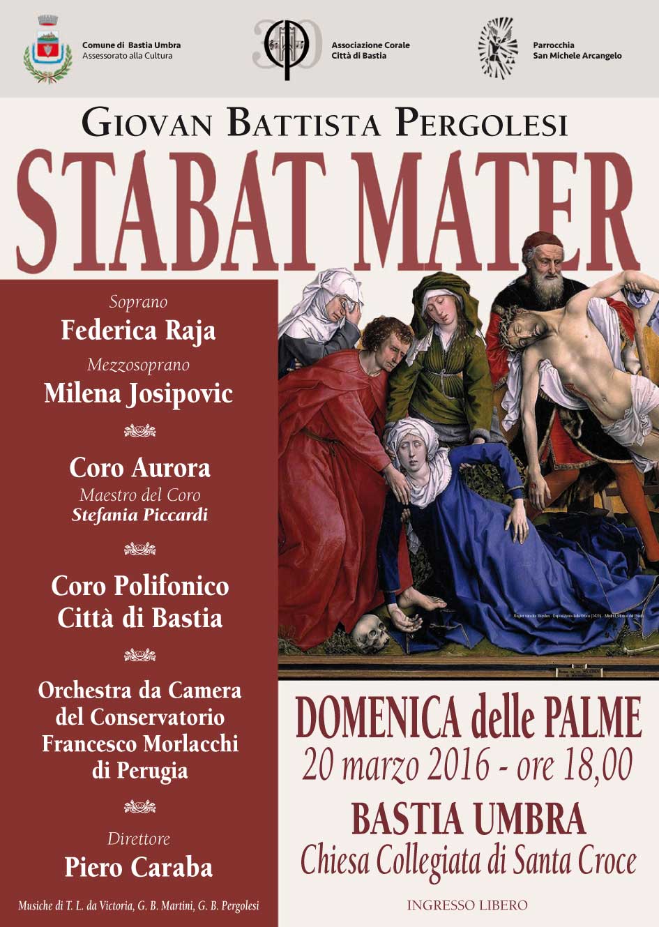 La Settimana Santa si prepara a Bastia Umbra con un concerto che vede impegnati, accanto al Coro Città di Bastia e al Coro Aurora, l’Orchestra da Camera del Conservatorio di Perugia , diretta per l’occasione da Piero Caraba. Quaranta artisti tra orchestra e voci: il soprano Federica Raja e il mezzosoprano Milena Josipovic.