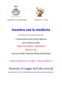 E’ organizzata dall’ Associazione “Casa Chiara” la conferenza” Malattie cardio – vascolari, infarto e BLS (Basic Life Support)”. La Conferenza si terrà presso l’Auditorium S. Angelo (Piazza Umberto I°) Domenica 19 Maggio alle ore 16.30. Relatore sarà il Dott. Antonio Maria Andricciola, socio dell’Associazione Casa Chiara, il quale tratterà  su un tema di sempre maggiore importanza, ossia quello delle malattie cardiovascolari, che costituiscono una delle principali cause di mortalità e che quindi devono essere ben conosciute da tutti per poterle ben curare ma soprattutto prevenirle. Il Basic Life Support (in italiano sostegno di base alle funzioni vitali, noto anche con l’acronimo BLS) è una tecnica di primo soccorso che comprende la rianimazione cardiopolmonare (RCP) e una sequenza di azioni di supporto di base alle funzioni vitali.