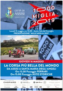 Lunedì 13 maggio, alle ore 15, presso la Sala del Consiglio Comunale, si svolgerà una conferenza stampa sulla Mille Miglia 2019, la corsa più bella del mondo, che giovedì 16 passerà per le strade di Assisi e Santa Maria degli Angeli.