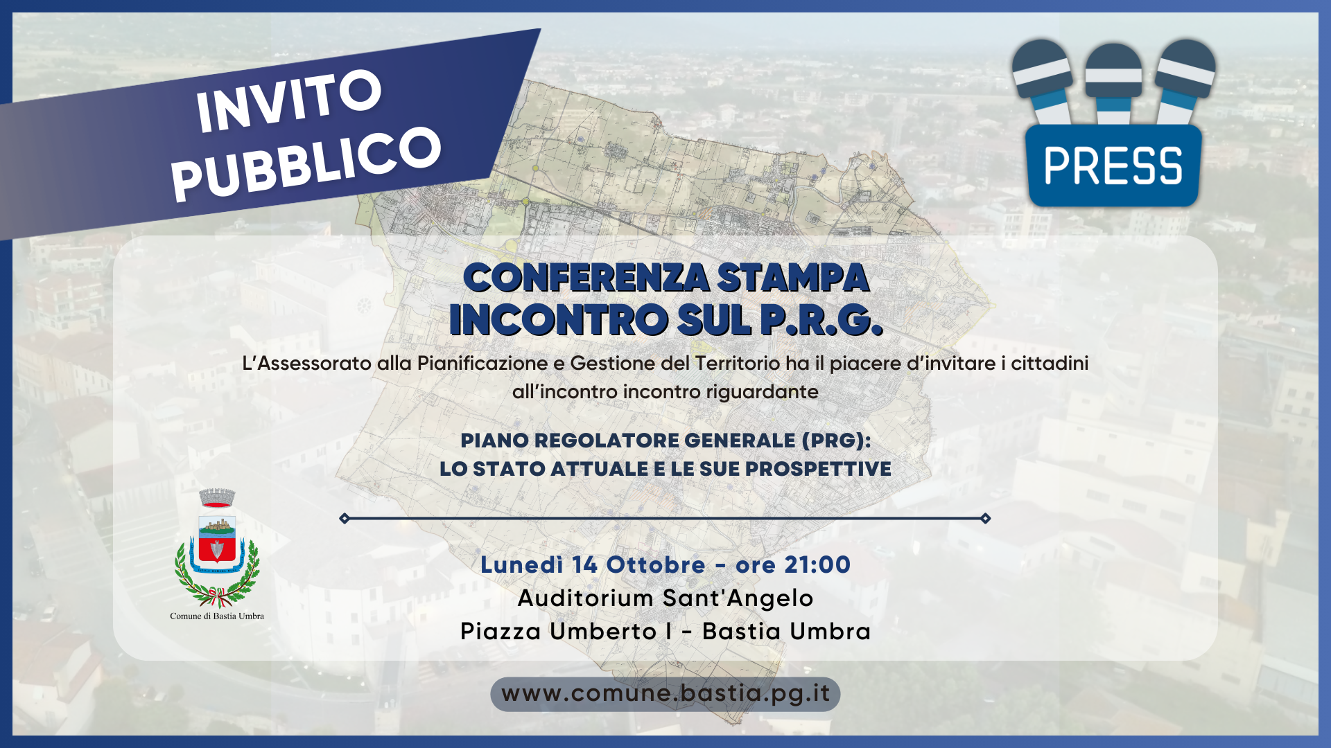 Bastia Umbra, 10 ottobre 2024 – Lunedì 14 Ottobre alle ore 21:00, presso l’Auditorium Sant’Angelo, si terrà una conferenza stampa indetta dall’Assessorato alla Pianificazione e Gestione del Territorio sul Piano Regolatore Generale (PRG), il suo stato attuale e le sue prospettive future. Si tratterà di un importante momento di condivisione a cui è invitata a partecipare tutta la cittadinanza.
