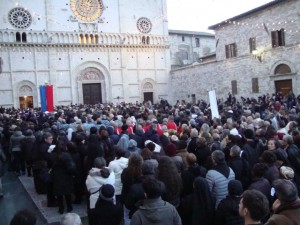 ASSISI – C’è voglia di pace tra le persone che, sia nel giorno dell’apertura della Porta santa della Cattedrale sia lunedì 14 dicembre, si sono recate a San Rufino per vivere in prima persona questo avvio del Giubileo e percorrere la strada della riconciliazione con Dio e della misericordia. Il pellegrinaggio dei fedeli, tanto numeroso domenica pomeriggio, è continuato anche il giorno successivo. Piera e Silvia, che hanno saputo dell’apertura della Porta santa attraverso le loro parrocchie di San Marco evangelista e San Michele Arcangelo di Bastia Umbra, sono arrivate a piedi dalla loro città. Un pellegrinaggio definito “molto bello e particolare, un’esperienza spirituale che nonostante la distanza percorsa a piedi e il freddo abbiamo voluto realizzare fino alla fine”. Rita di Valfabbrica che è venuta a conoscenza dell’apertura della Porta santa tramite il suo parroco ha definito la cerimonia “molto toccante coinvolgente e partecipata. Dall’Anno santo ho diverse aspettative non solo sul piano strettamente personale ma a livello umano”. La famiglia Mencarelli di Costano si aspetta “pace, felicità e serenità in questo mondo turbolento. Nel varcare la Porta santa – raccontano – abbiamo provato una bella e profonda sensazione; la cerimonia poi è stata davvero bella e suggestiva”. Per Giovanni e Susy di Santa Maria degli Angeli il giubileo deve rappresentare “un momento di inclusione mondiale”. Tre signore di Foligno si aspettano che questo Anno santo “porti la pace nel mondo e dentro di noi ma sappiamo anche – hanno poi aggiunto – che è difficile realizzare questo sogno. Intanto qui all’interno della Cattedrale respiriamo una sensazione di grande benessere”.