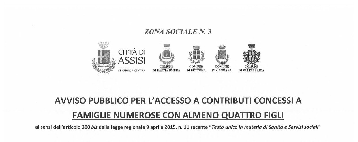 E’ stato pubblicato un avviso pubblico per l’accesso ai contributi a favore di famiglie con almeno 4 figli. Si tratta di un provvedimento di sostegno economico finalizzato a sostenere le famiglie numerose che in quanto tali hanno un maggior carico di lavoro nella crescita e nell’educazione dei figli.