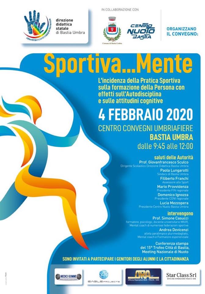 La Direzione Didattica di Bastia Umbra, nell’ambito di una sensibilizzazione dei giovani nei confronti dell’importanza dell’attività sportiva e della sua ripercussione positiva in ambito educativo e formativo, organizza, in collaborazione con il Centro Nuoto Bastia ed il Comune di Bastia Umbra, il Convegno “Sportiva…Mente” presso il Centro Convegni dell’Umbriafiere nella mattinata di martedì 4 febbraio 2020, dalle ore 9:15 alle ore 12:45 circa.