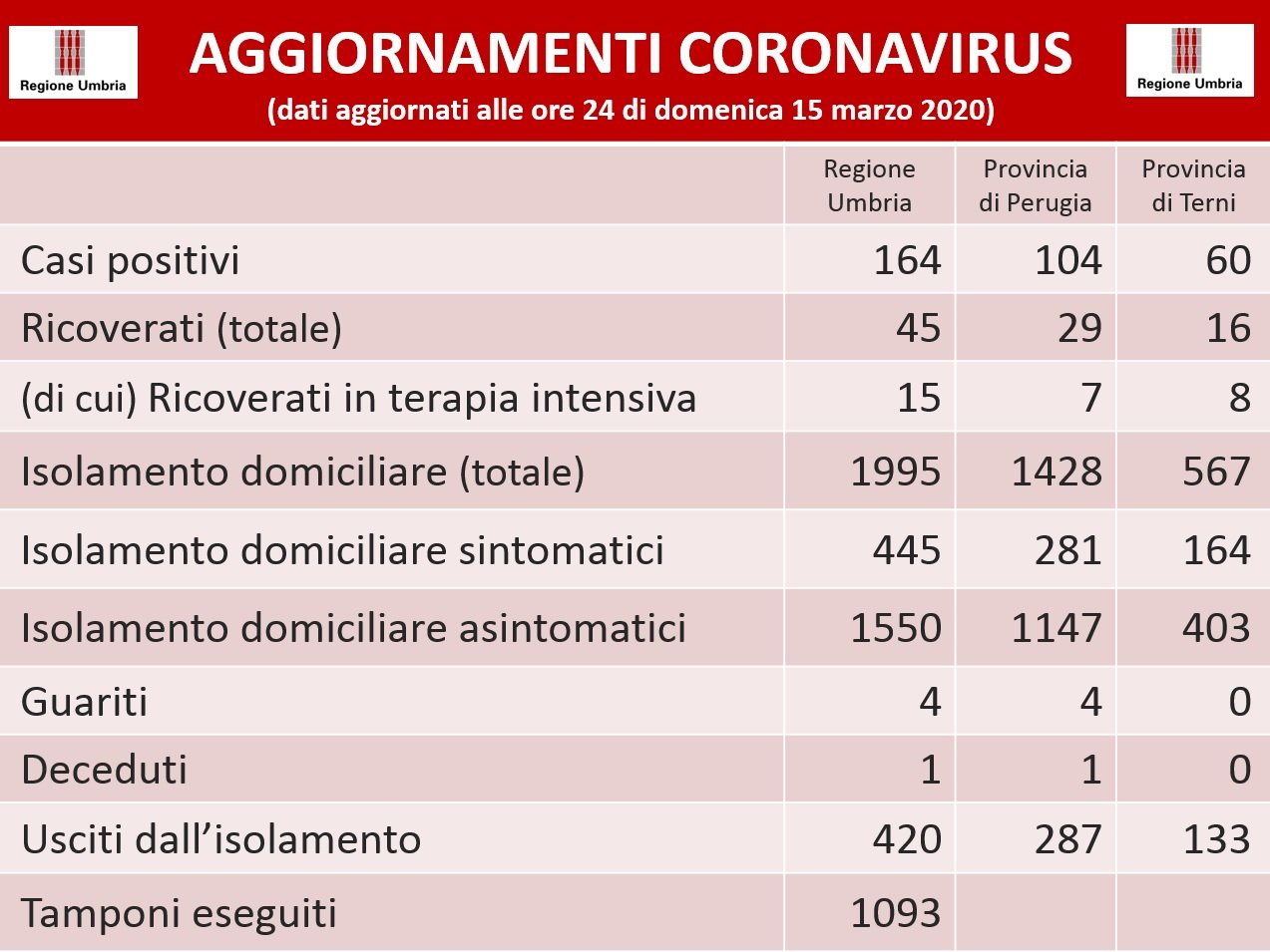 REGIONE UMBRIA – Dai dati aggiornati alla mezzanotte del 15 marzo, 164 persone in Umbria risultano positive al virus Covid-19, mentre 4 pazienti sono guariti.
