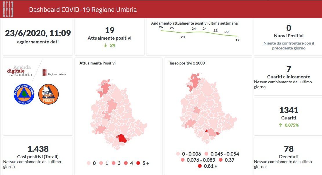Scendono ancora i positivi in Umbria per l’emergenza Covid-19. Dai dati aggiornati alle ore 11:09 di oggi 23 giugno, 1438 persone in Umbria risultano in totale positive al virus (+0 rispetto a ieri), gli attualmente positivi sono 19 (-1 rispetto a ieri), i guariti sono 1341 (+1 rispetto a ieri).