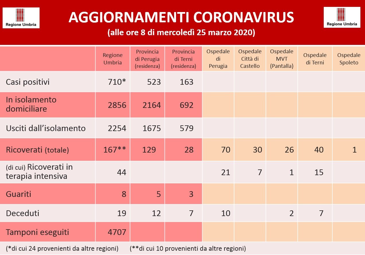 Sono 710 i pazienti risultati positivi, di cui 44 in terapia intensiva (+1 rispetto a ieri). Sono dislocati negli ospedali di Perugia, Terni, Città di Castello e Pantalla, secondo i dati emanati dalla Regione Umbria,