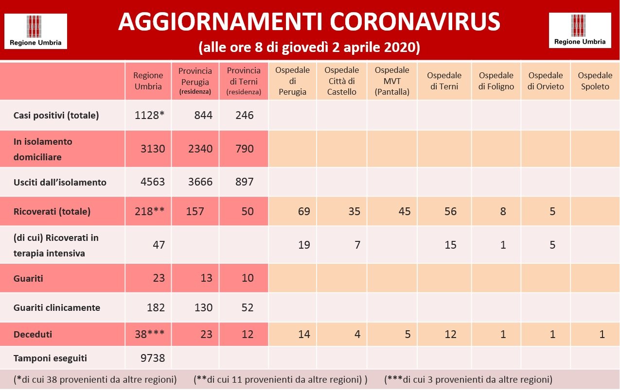 Coronavirus, i dati aggiornati al 02 aprile della Regione Umbria