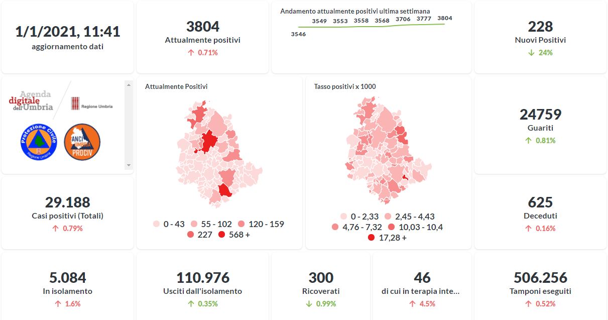 Il 2021 si apre con un aumento del numero degli attualmente positivi al Covid-19 in Umbria . Dai dati aggiornati alle ore 11:41 di oggi 1° gennaio, 29.188 persone in Umbria risultano in totale positive al virus (+228 rispetto a ieri) , gli attualmente positivi sono 3.804 (+27 rispetto a ieri), i guariti sono 24.759 (+200 rispetto a ieri).