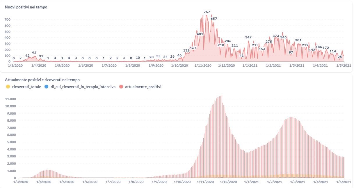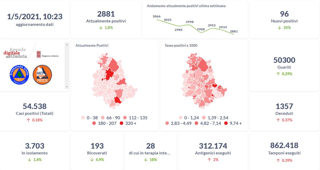La curva degli attualmente positivi al Covid-19 in Umbria sta lentamente scendendo nelle ultime settimane. Dai dati aggiornati alle ore 10:23 di oggi 1° maggio, 54.538 persone in Umbria risultano in totale positive al virus (+ 96 rispetto a ieri) , gli attualmente positivi sono 2.881 (-52 rispetto a ieri), i guariti sono 50.300 (+143 rispetto a ieri).