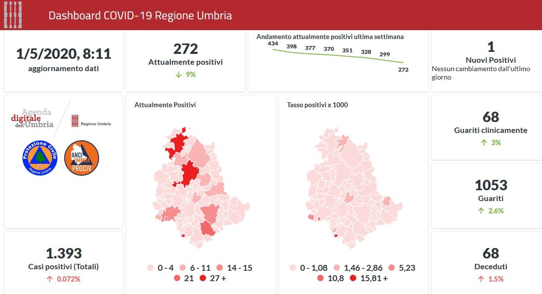 Continua il trend in forte miglioramento in Umbria dei contagiati di Covid-19. Dai dati aggiornati alle ore 08:11 di oggi 1 maggio, 1393 persone in Umbria risultano positive al virus (+1 rispetto a ieri), gli attualmente positivi sono 272 (-27 rispetto a ieri), i guariti sono 1053 (+27 rispetto a ieri).